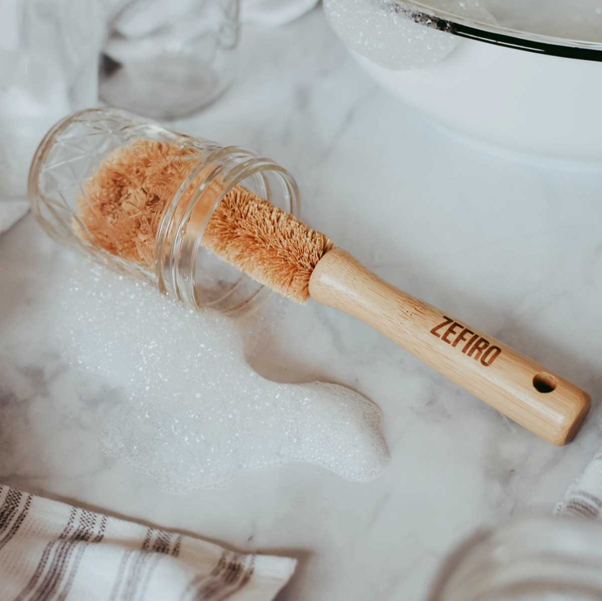 A sustainable alternative to plastic bottle brushes, this versatile design fits easily into glasses, mugs, vases, and jars.