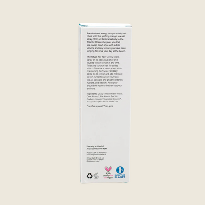 Description: Breathe fresh energy into your daily hair ritual with this uplifting mango sea salt spray. With an identical salinity to the Atlantic Ocean, she gives you that sea-swept beach style with subtle volume and sexy texture you have been longing for since your day at the beach.