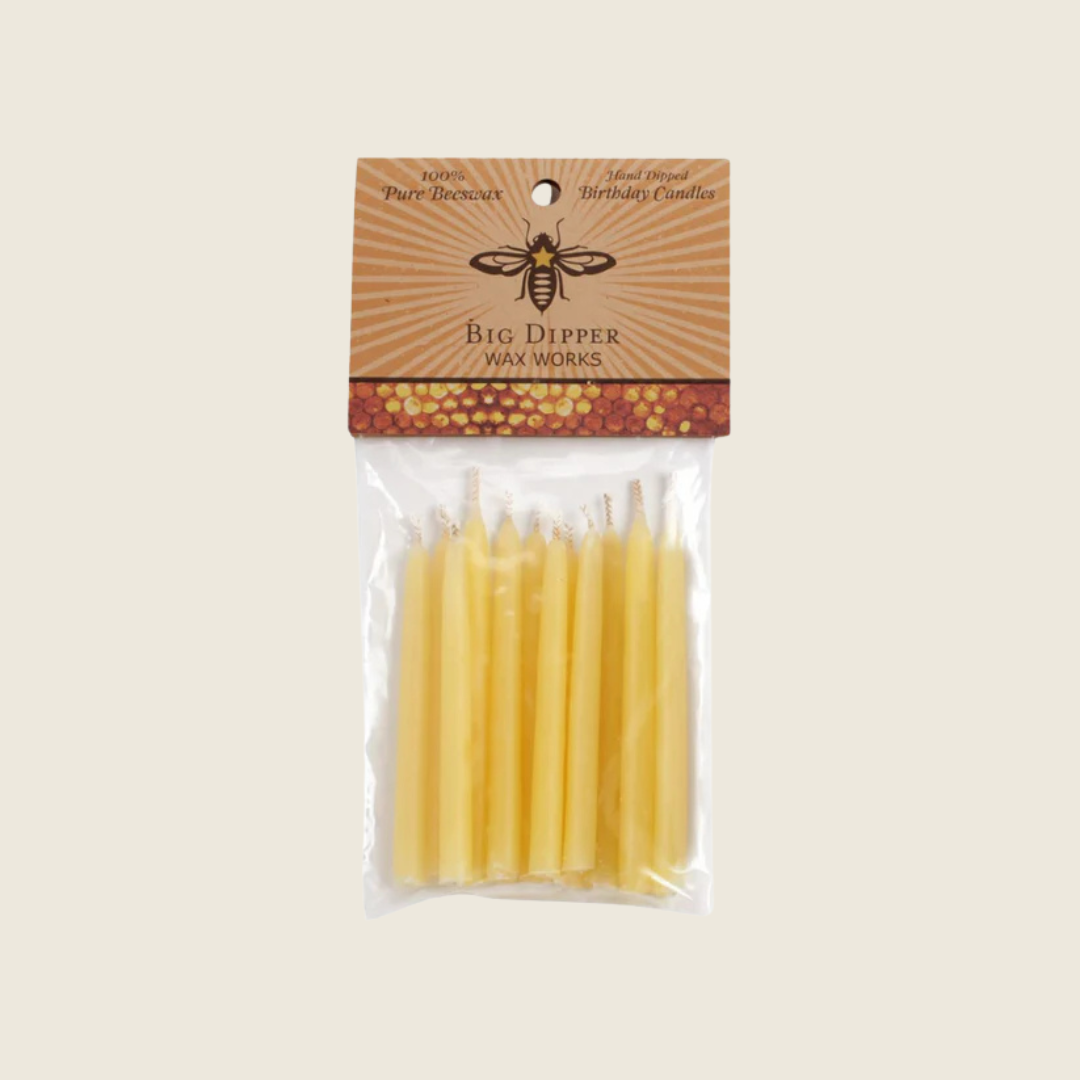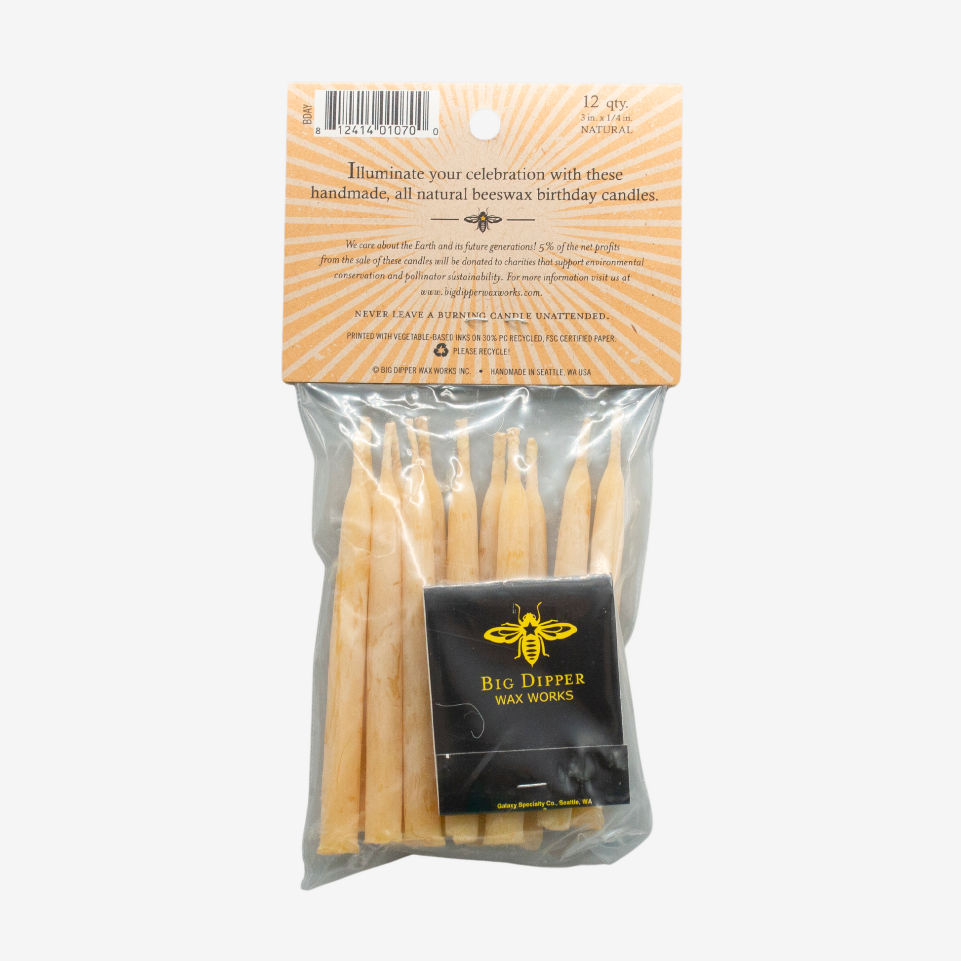 Description: Celebrate every special day with a dozen hand dipped 100% Beeswax Birthday Candles. All-natural celebration at its best! Our candles are the safest option for placing on your birthday cake because we make them with absolutely no synthetic materials and pure beeswax. Each candle promises enough burn time to be used for multiple celebrations. Product Details * Dimensions: 3" x 1/4" * Each candle will burn for several minutes.