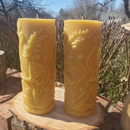 Pillar candles are long lasting and burn nicely. The ferns wrapped around the candle offer a whimsical, romantic feel to your home. Burn time is over 80+ hours if taken care of properly by trimming wick and hugging sides of pillar to feed the wax pool.