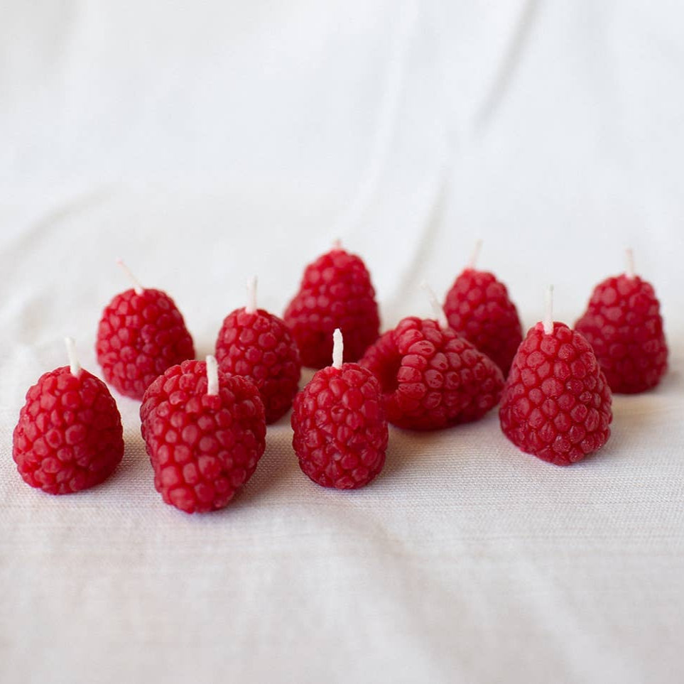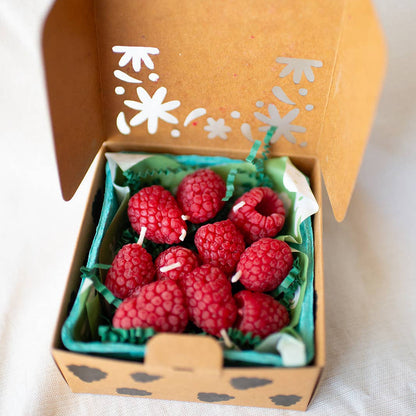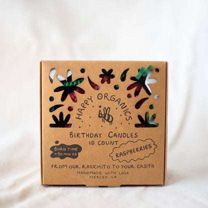 Celebrate with our non-toxic small batch Raspberry birthday candles, consisting of 100% pure beeswax made from the honey our bees consume. Comes with 10 raspberry birthday candles! The packaging includes the berry basket with green crinkle cut inside the brown kraft box.