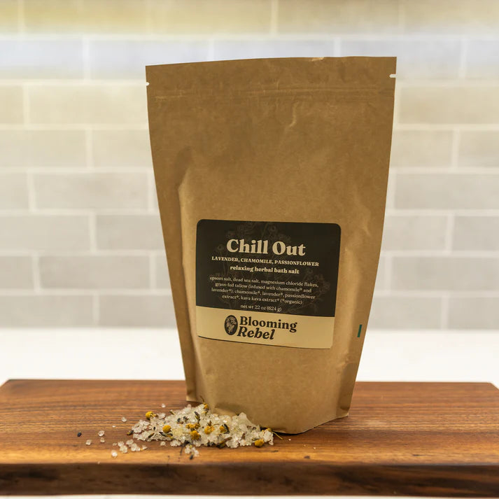Unwind and let go with Chill Out bath salts, a calming blend designed to ease you and your muscles into relaxation. Featuring classic chamomile and lavender. Added passionflower and kava kava extracts amplify the relaxing effects for the mind and muscles.