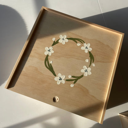 Small is a 8 x 8 x 3 wooden gift box.