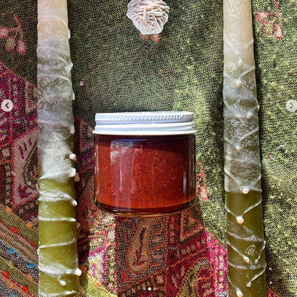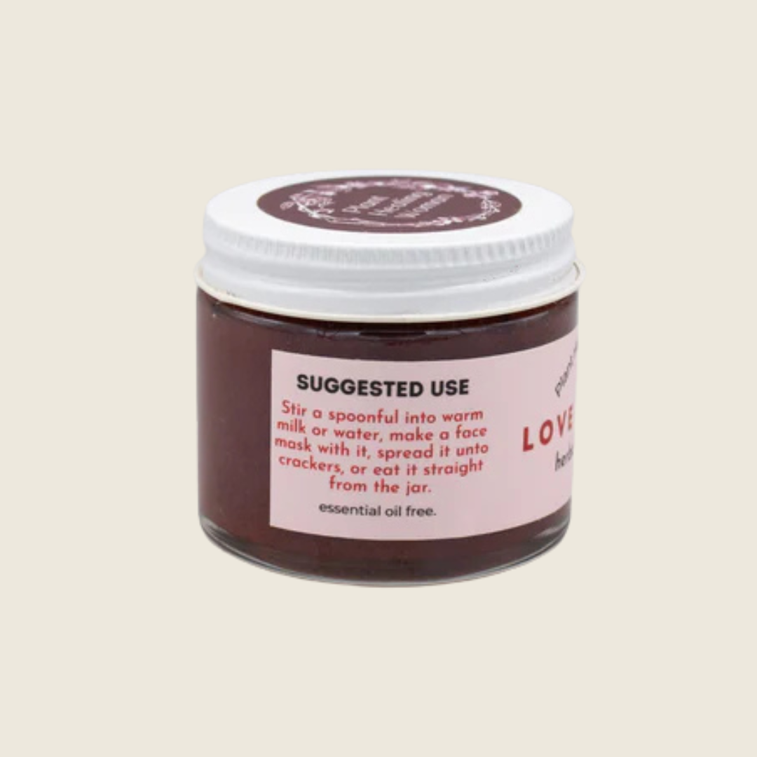An herbal electuary is simply raw + organic powdered herbs. This warming and heart opening blend includes aphrodisiac herbs such as organic rose petals, hibiscus, and cinnamon infused into raw honey. This herbal honey will fill your heart with joy and make self love feel easy. People LOVE spreading this over a slice of toast with butter and a cup of coffee. It makes the perfect house warming or birthday gift for anyone who likes honey!