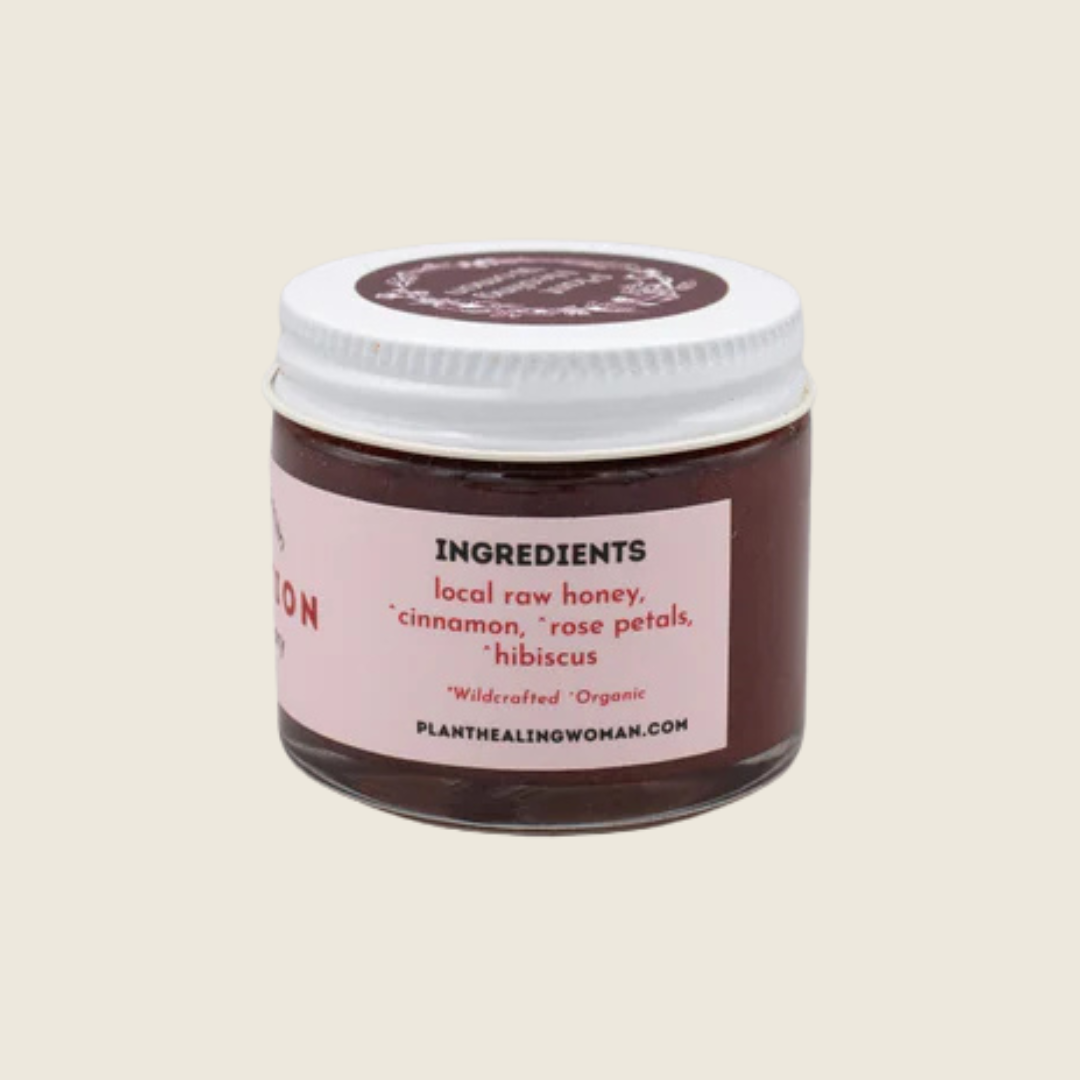 Organic rose petals, hibiscus, and cinnamon infused into raw honey.
