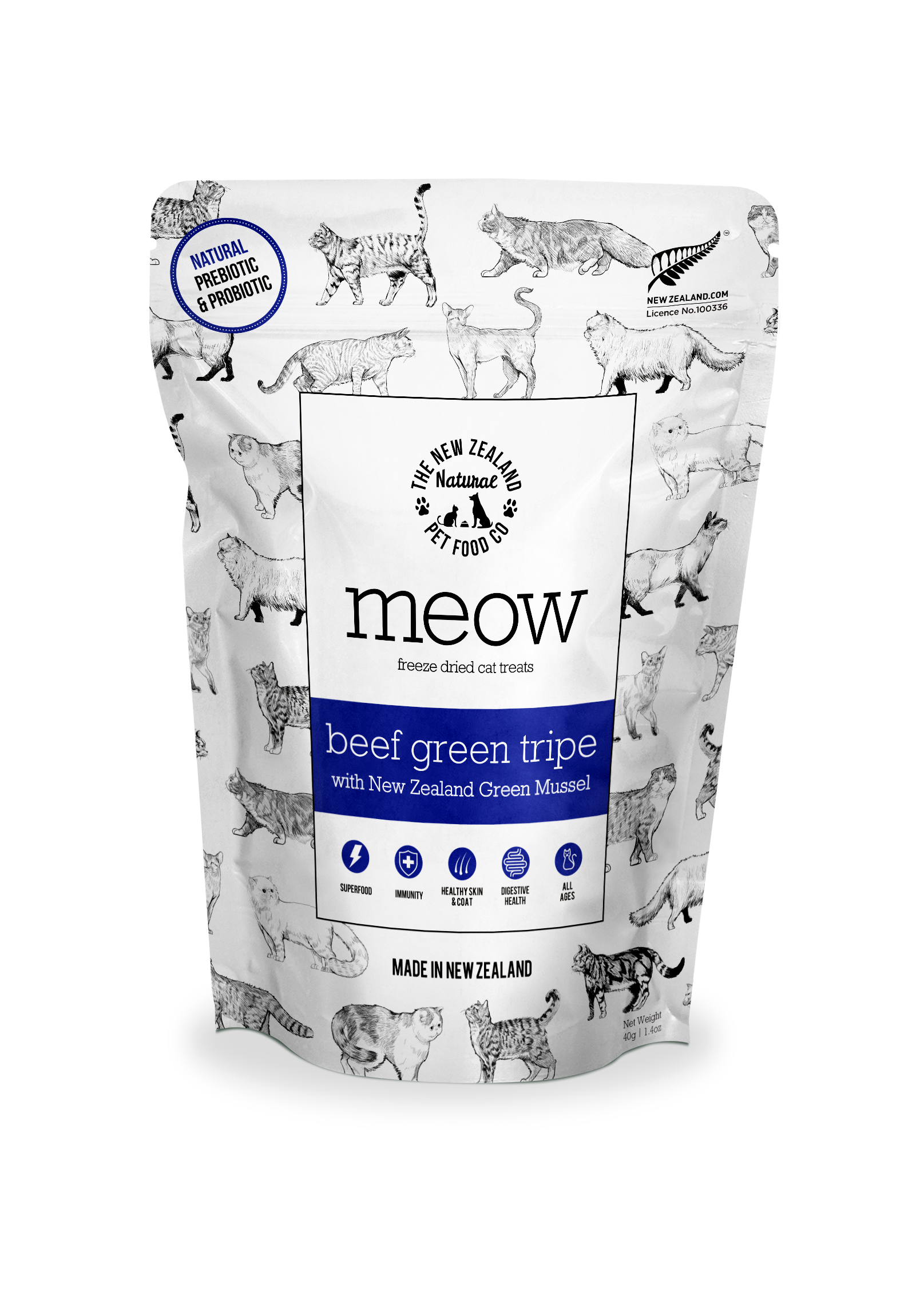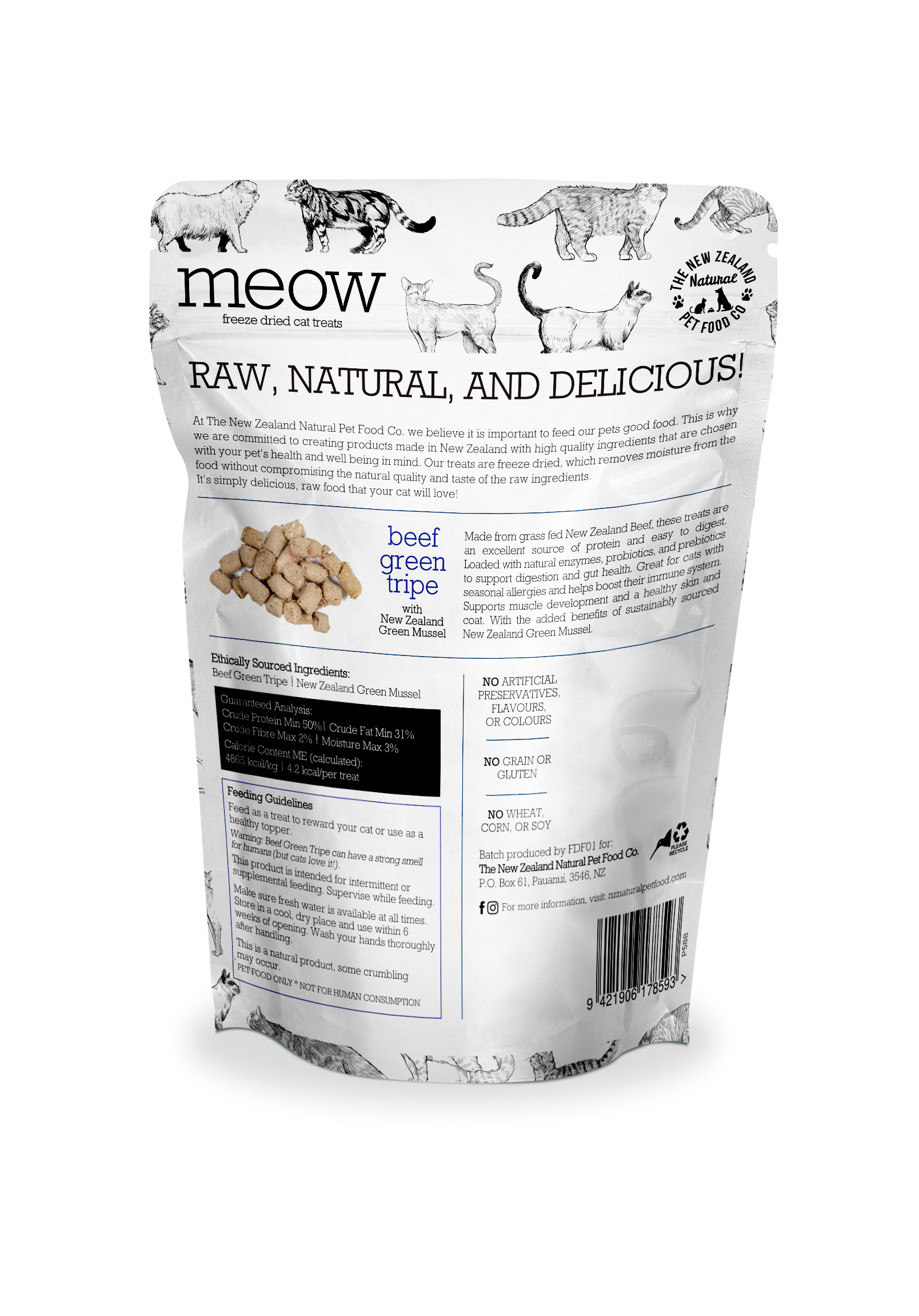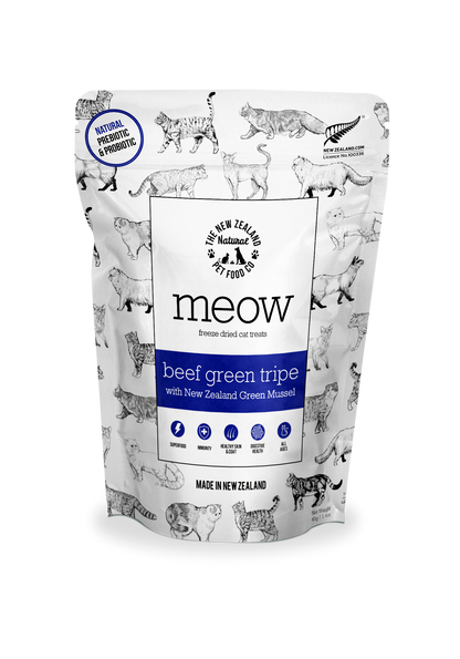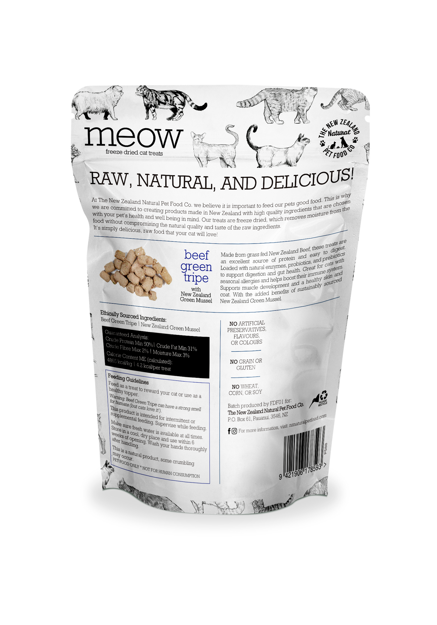 MEOW Beef Green Tripe w/ NZ Green Mussel Treats are a healthy, protein rich treat. Full of natural probiotics and prebiotics to support a healthy gut and digestion system. With added NZ Green Mussels which are renowned for their health benefits; high in omega-3 fatty acids and a great source of glucosamine which supports joint health. Gently freeze-dried to protect all the natural enzymes and nutrients, so none of the wholesome goodness is cooked out. Raw, Natural, and Delicious!