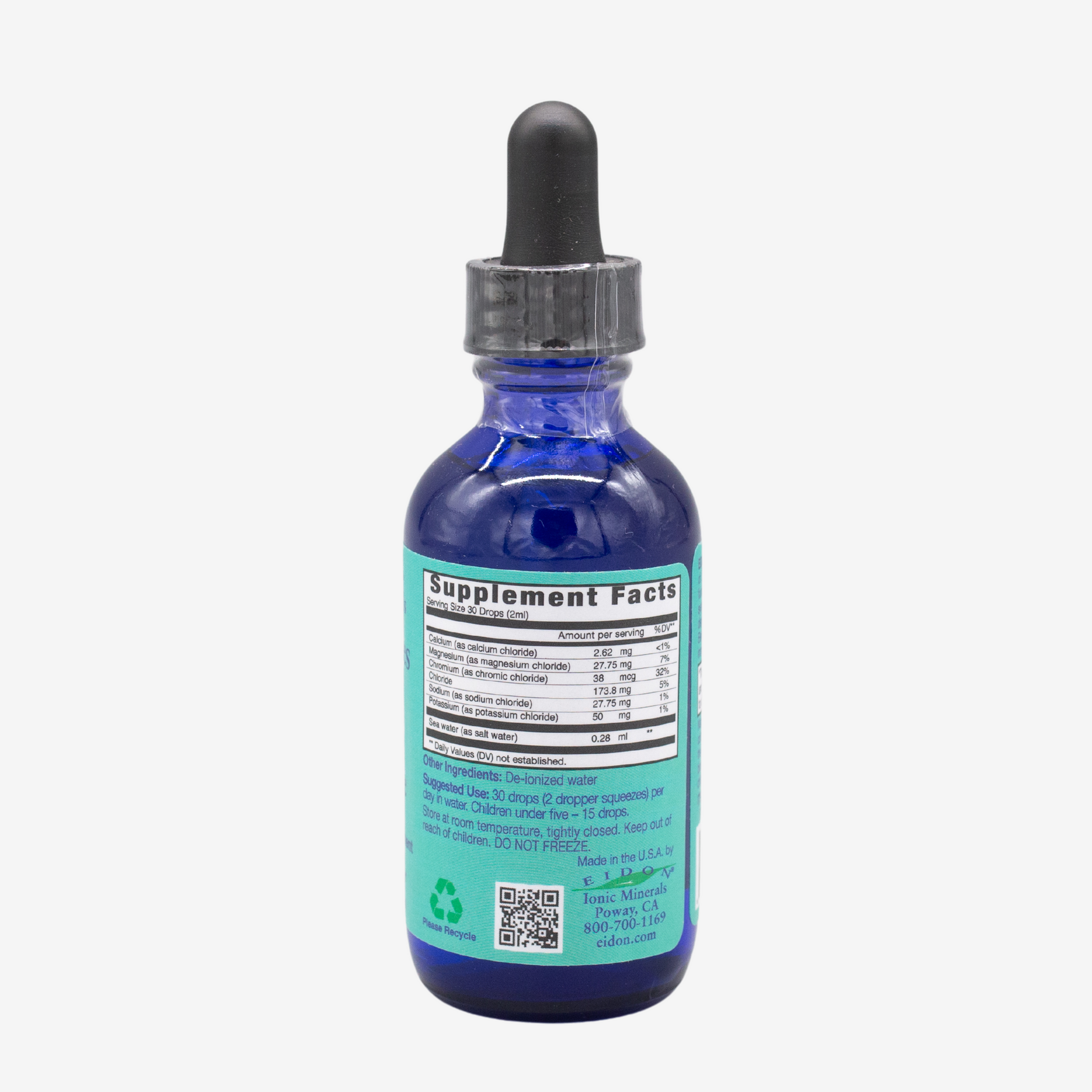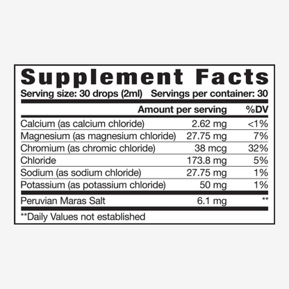 Ingredients: Calcium (as calcium chloride), Magnesium (as magnesium chloride), Chromium (as chromic chloride), Chloride, Sodium (as sodium chloride), Potassium (as potassium chloride), Sea water (as salt water), De-ionized water