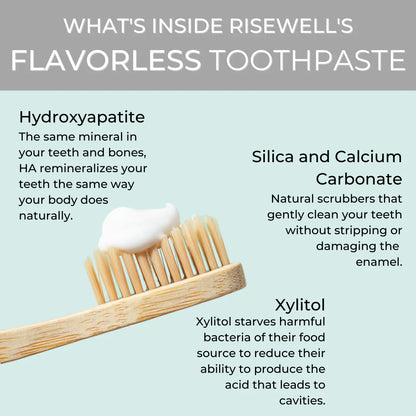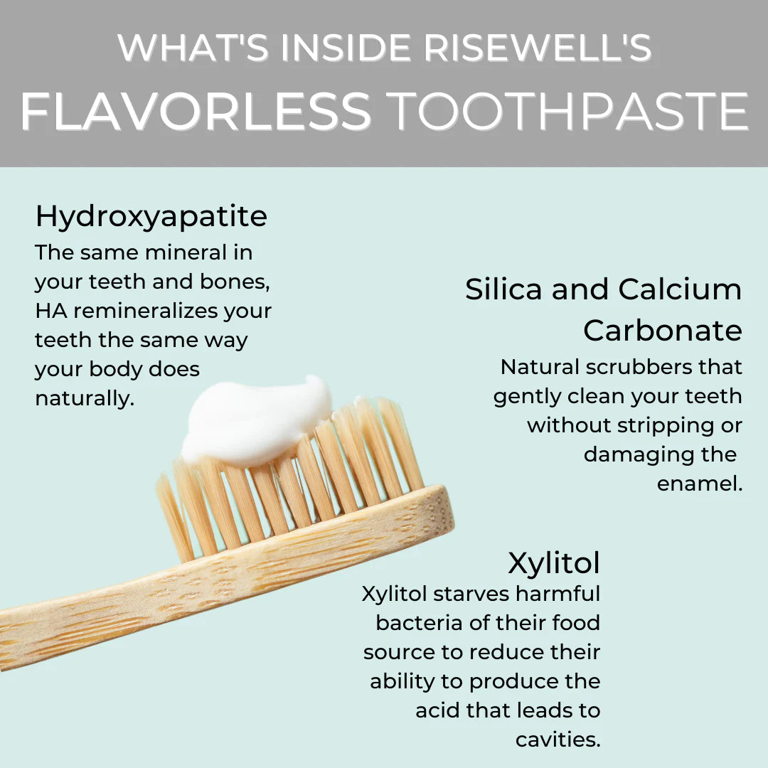 RiseWell's Flavorless Mineral Toothpaste is a gentle, flavor-free formula designed for sensitive users. Powered by hydroxyapatite, it strengthens, remineralizes, and protects teeth without artificial sweeteners, sugar, essential oils, or extracts. It's allergy-friendly and offers a clean, safe, and naturally effective alternative for dental care.