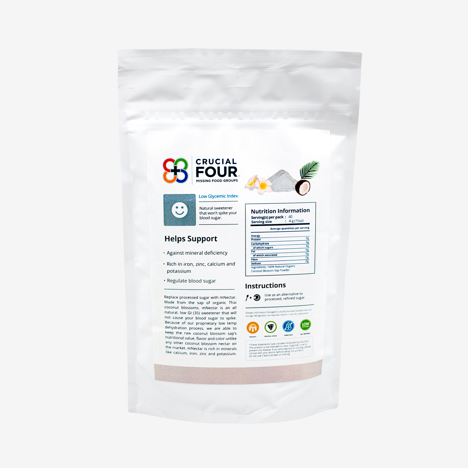 Replace processed sugar with mNectar. Made from the sap of organic Thai coconut blossoms, mNectar is an all natural, low GI (35) sweetener that will not cause your blood sugar to spike. Because of our proprietary low temp dehydration process, we are able to keep the raw coconut blossom sap’s nutritional value, flavor and color unlike any other coconut blossom nectar on the market. mNectar is rich in minerals like calcium, iron, zinc and potassium.
