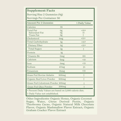 Cherry Chocolate: Grass Fed Bovine Gelatin, Organic Grass Fed & Finished Beef Liver Powder, Grass Fed Colostrum Powder, Grass Fed Ghee, Organic Honey, Organic Coconut Sugar, Water, Citrus Derived Pectin, Organic Theobroma Cacao, Organic Natural Milk Chocolate Flavor, Organic Mashmallow Flavor Extract, Organic Burnt Sugar Flavor Extract, Organic Graham Cracker Flavor Extract