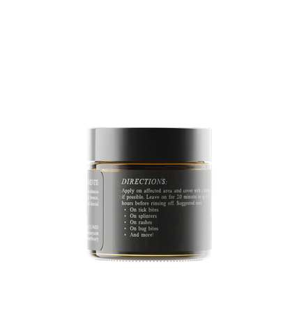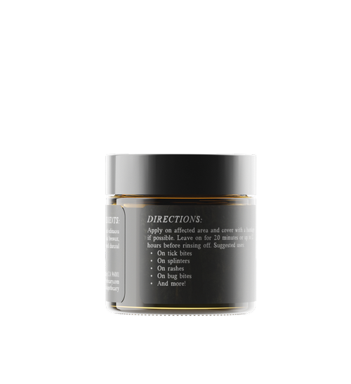 This salve is smooth yet slightly sticky. Apply to bug bites, splinters, and more, and cover with a bandage. Leave the salve on for a few hours or up to 12 hours, then gently remove it with a wet washcloth. Avoid getting on clothing as this salve can stain due to the charcoal.