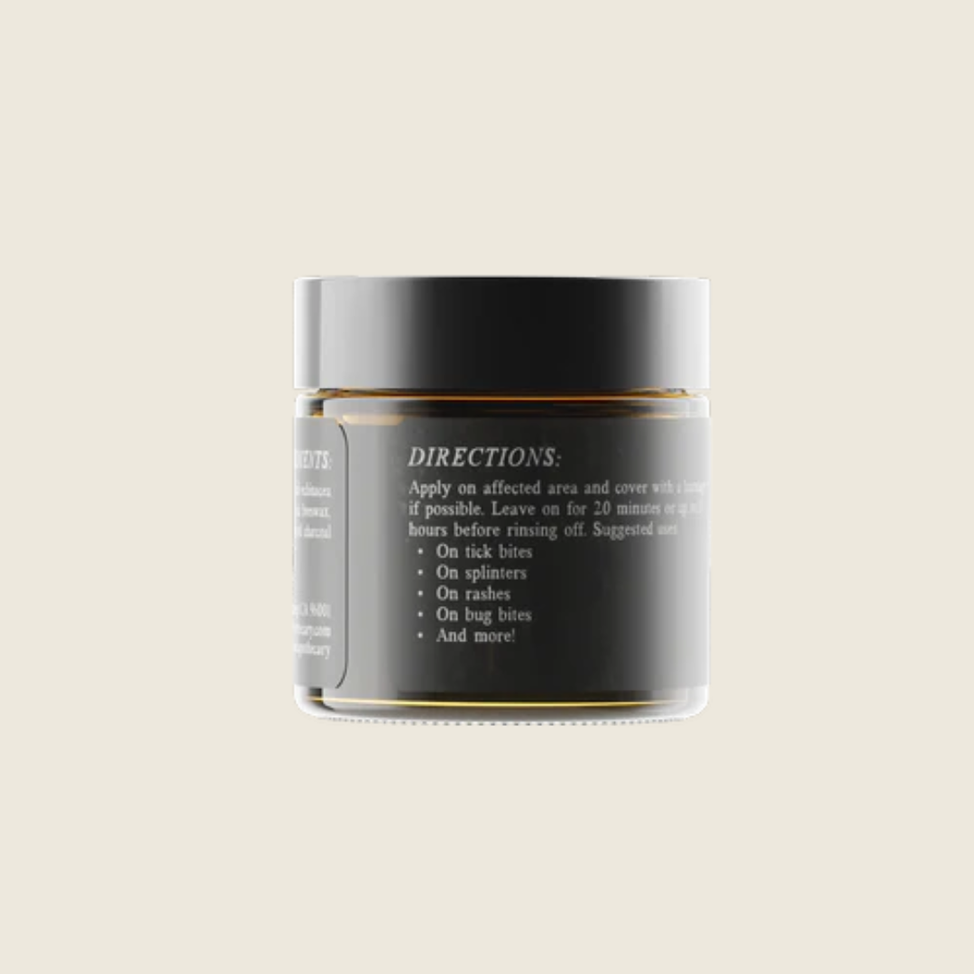 This salve is smooth yet slightly sticky. Apply to bug bites, splinters, and more, and cover with a bandage. Leave the salve on for a few hours or up to 12 hours, then gently remove it with a wet washcloth. Avoid getting on clothing as this salve can stain due to the charcoal.
