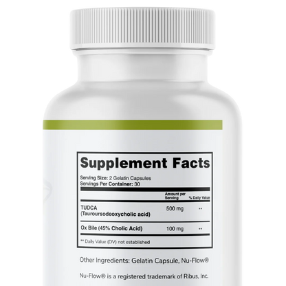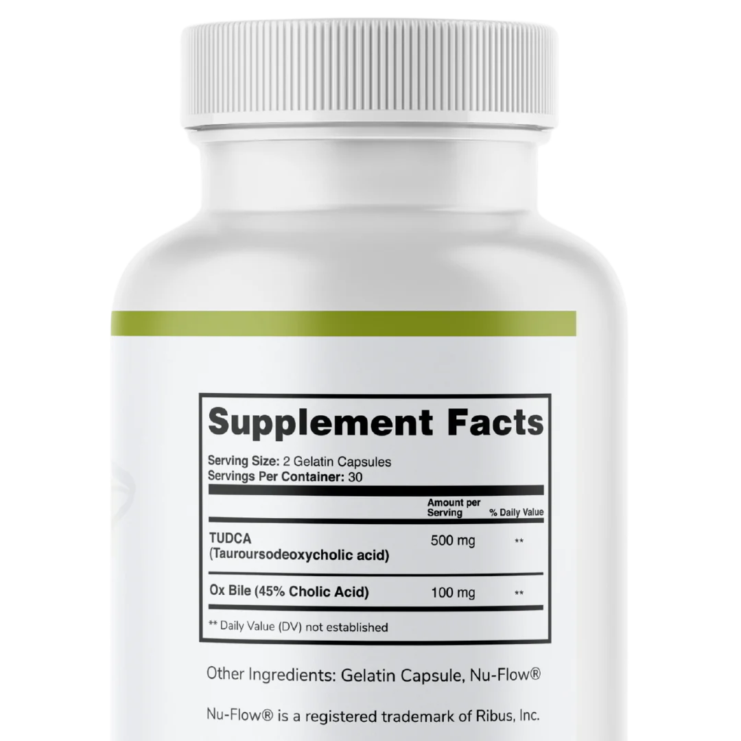 Tauroursodeoxycholic acid (TUDCA) is a water-soluble, conjugated bile salt. It is produced in the liver using cholesterol, deoxycholate (which is made in the intestine by bacteria and cholic acid), and the amino acid Taurine. Supplementing with TUDCA can aid digestion, liver health and detoxification by increasing bile flow and clearing out sludgy bile.