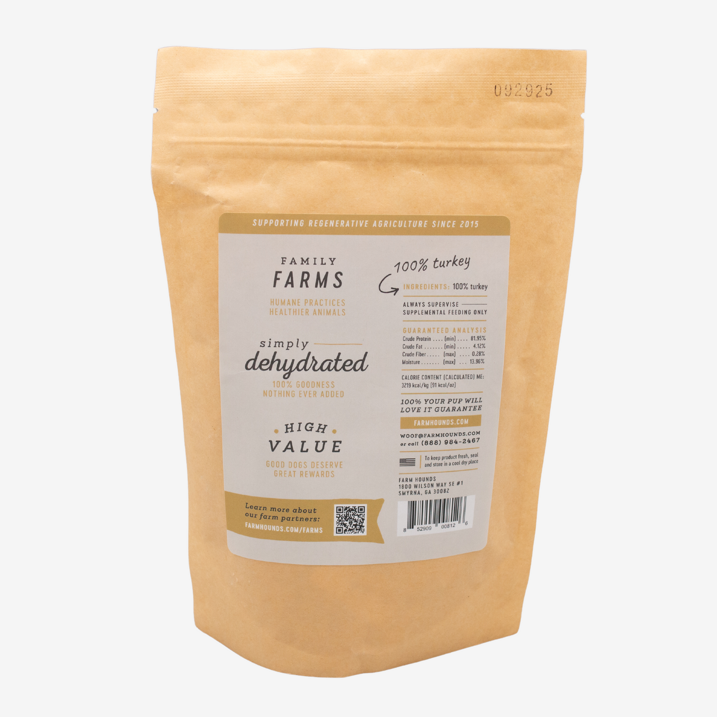 Only the GOOD stuff: Every bag is 100% Turkey that is transparently sourced from family farms! With the power of dehydration, we offer your pups treats that are free of salt, sugar, fillers, chemicals, and preservatives!