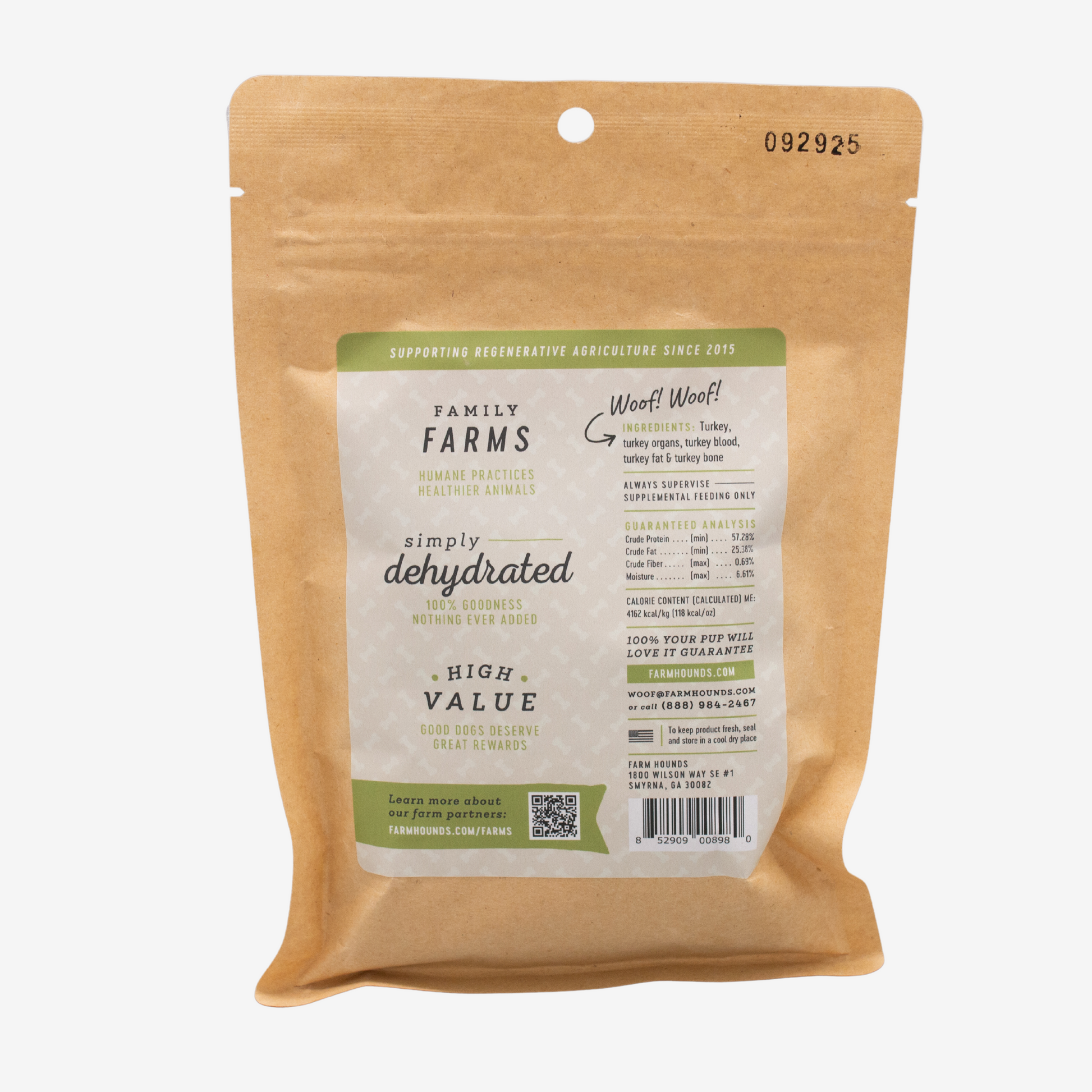 Only the GOOD stuff: Every bag is 100% Turkey that is transparently sourced from family farms! With the power of dehydration, we offer your pups treats that are free of salt, sugar, fillers, chemicals, and preservatives!