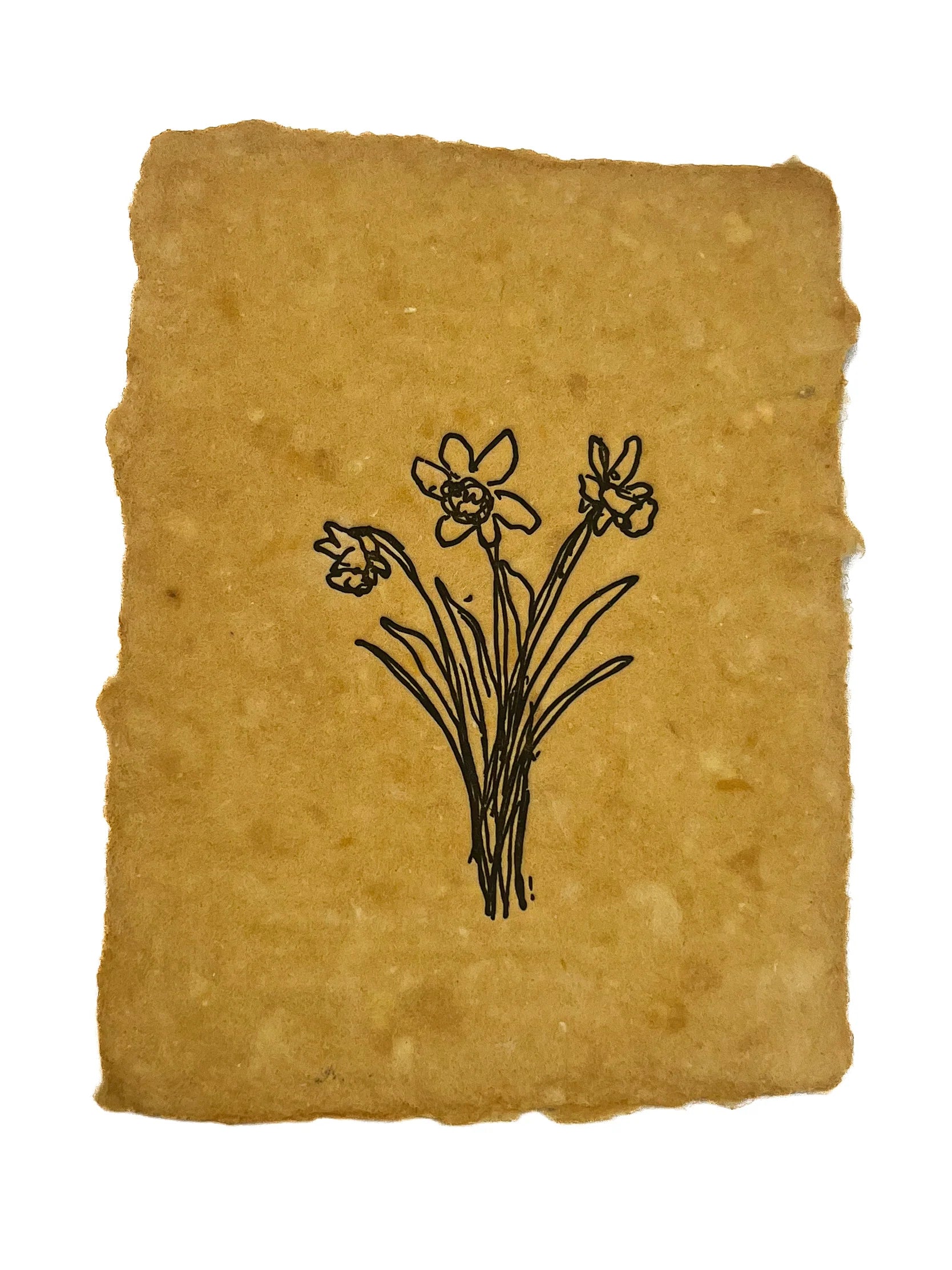 Honey paper with black letterpress, features an illustration of narcissus flowers (daffodils!). Full deckle edge paper handmade in our California studio, hand-fed onto antique letterpresses for a textured deboss.