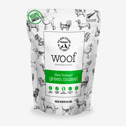 WOOF NZ Green Mussel Treats are a healthy, protein-rich snack for your dog. New Zealand Green Lipped Mussels are renowned for their health benefits; they are high in omega-3 fatty acids, and a great source of glucosamine which supports joint health. These WOOF treats have been gently freeze-dried to protect all the natural enzymes and nutrients, so none of the wholesome goodness is cooked out. Raw, Natural, and Delicious!