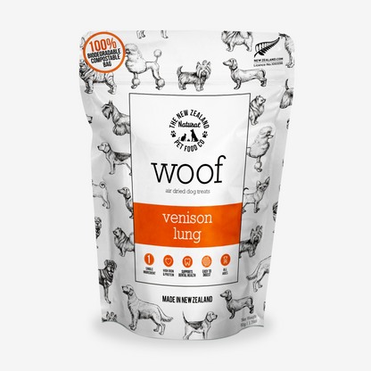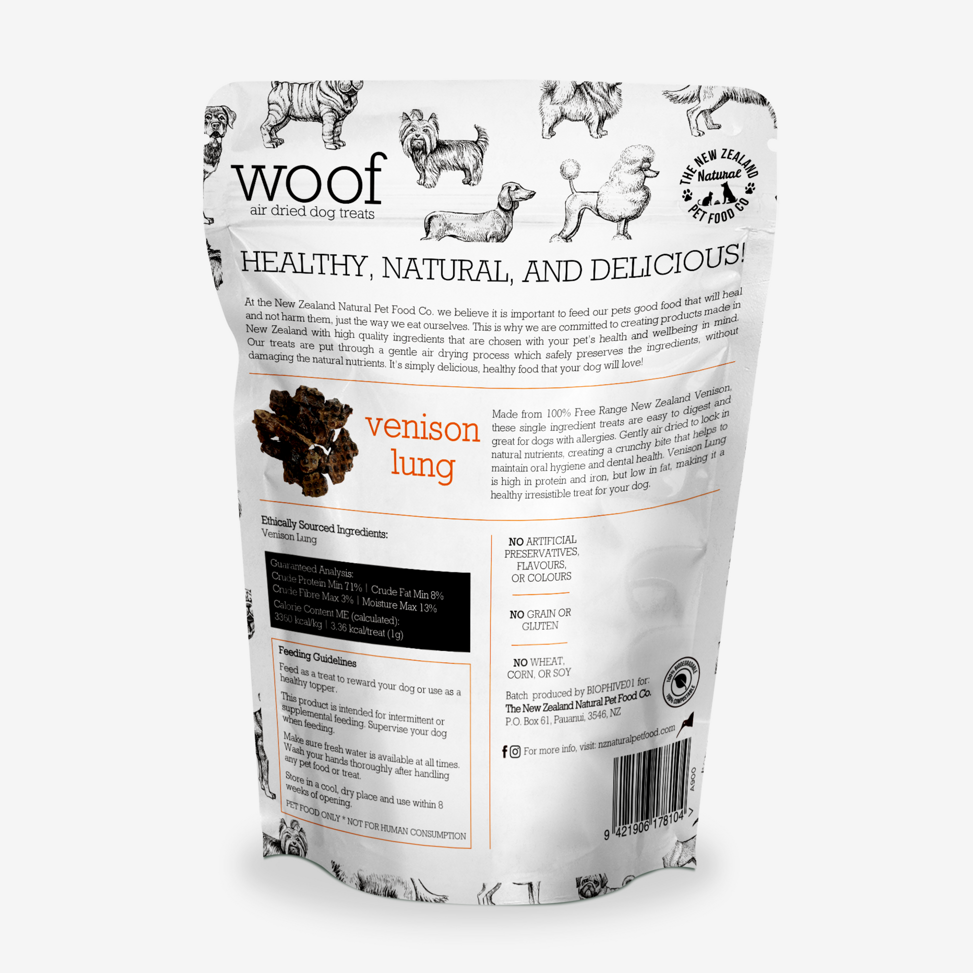 WOOF Venison Lung Treats are a healthy, protein-rich snack for your dog. These WOOF treats are gently air-dried to lock in natural nutrients, creating a crunchy bite that helps to maintain oral hygiene and dental health. Venison Lung is high in protein and iron, but low in fat, making it a healthy irresistible treat for your dog. Healthy, Natural, and Delicious Made from 100% Free-Range New Zealand Venison, these single-ingredient treats are easy to digest and great for dogs with allergies.