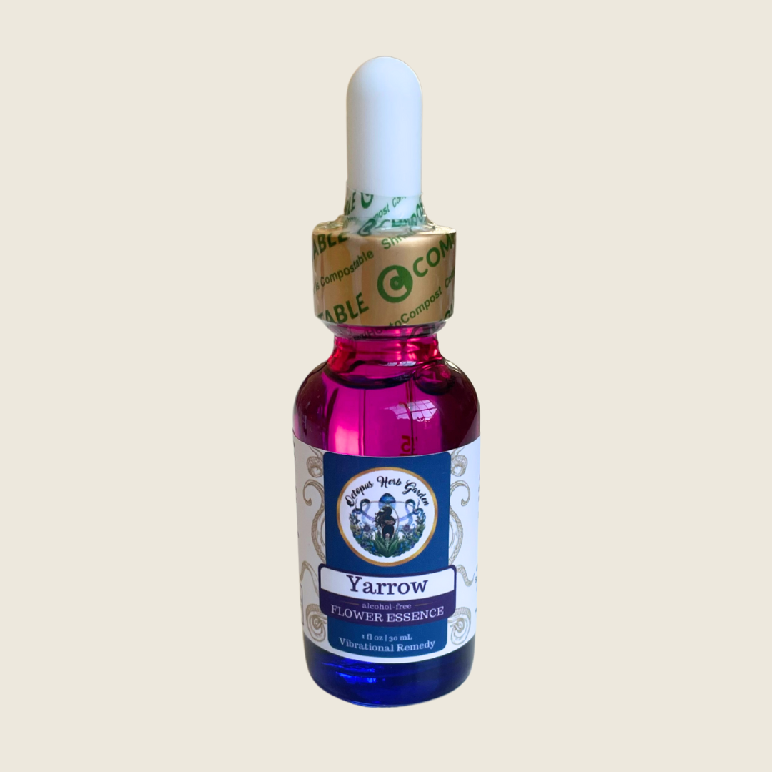 Comes in a 1oz glass dropper bottle filled with Certified Organic Glycerin (Derived from Flax), Purified Spring Water, & Yarrow (Achillae millefolium) Flower Essence.